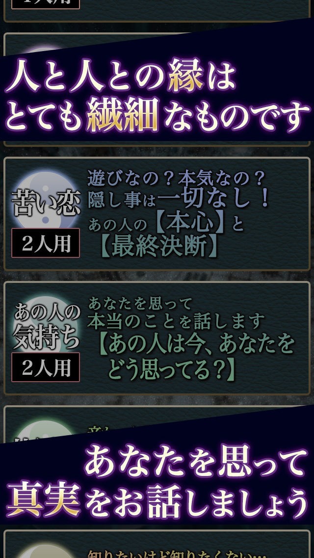 ※一度ご購入された有料メニューでも、「異なる端末でアプリをインストールした場合」や、「一度アプリをアンインストールしてから再度インストールし直した場合」には再購入が必要となります。ご了承くださいますよう、お願い致します。