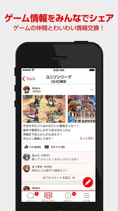 ・コミュニティではゲーム内と連動したユーザーで、質問やギルドメンバーの募集等を行えます。