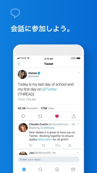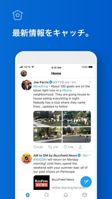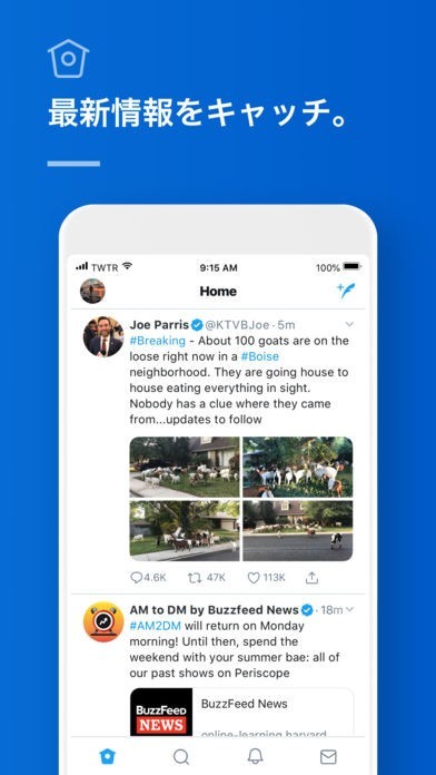 「Twitter」は短文のつぶやきを投稿できるアプリです。 国内外の芸能人や有名人といつでもどこでも交流できるようになります。 紙の新聞では朝刊夕刊の2回だけです。 テレビのニュースでは放送時間まで待つ事が必要です。 しかしこのアプリなら新鮮な情報が表示されるのが良い点です。 他のユーザーから情報を入手するのは勿論の事、自ら情報発信する事も可能です。 ハッシュタグを付けてツイートすると共通の興味を持っているユーザーからのアクセスが増えやすくなります。 ハッシュタグで検索すると自分の興味を持っているツイートが簡単に見つかります。