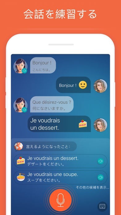「Mondly: フランス語を無料で学ぼう」の最大の魅力は、最新の音声認識機能を使った発音チェックです。会話レッスンで、スピーカーの後に続いて言葉を発してみてください。認識機能がユーザーの発音を採点してくれます。