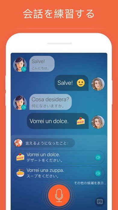 「Mondly: イタリア語を無料で学ぼう」のメインコンテンツは、音声認識機能を使った疑似会話です。ネイティブスピーカーが話したあとに、マイクボタンを押して自分も喋ってみてください。認識機能があなたの発音のどこが悪いのか、判定してくれます。