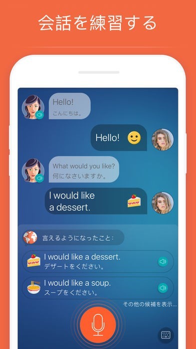 普段SNSでやり取りしているときと同じようにチャットスタイルでの学習が行えます。素早く文章を考えるトレーニングにもなります。マイクに向かって話しかけてみましょう。