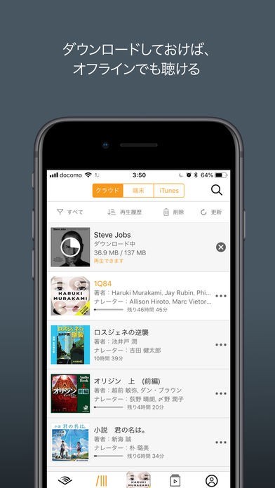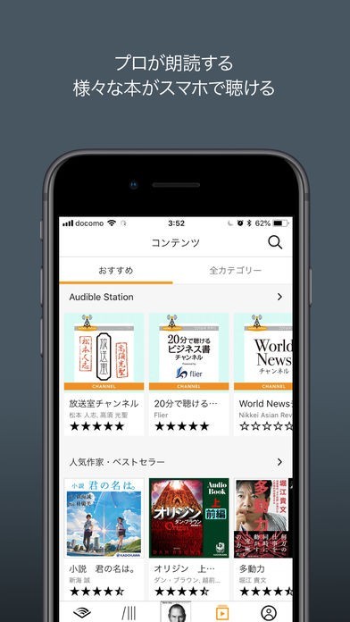 「Audible (オーディブル) - 本を聴こう」は、ビジネス書や落語、小説をプロのナレーターの方が音読してくれるアプリです。アマゾンのアカウントで始めることができ、20以上のジャンルを聴くことができます。オーディオブックは事前ダウンロードになっていますので、オフライン時でも聴くことが可能です。再生スピードが自由に変更できるので、自分に合わせた速さに合わせられます。フェイスブックなどのSNSでの共有機能があり、現在聴いているタイトルをシェアできます。