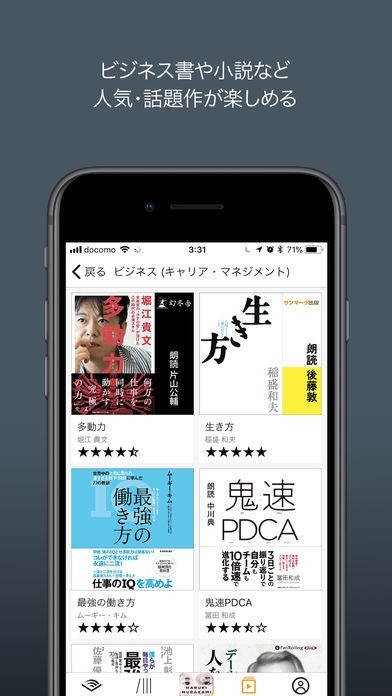 ビジネス書など20以上のジャンルの本を、ナレーターが音読してくれるアプリ