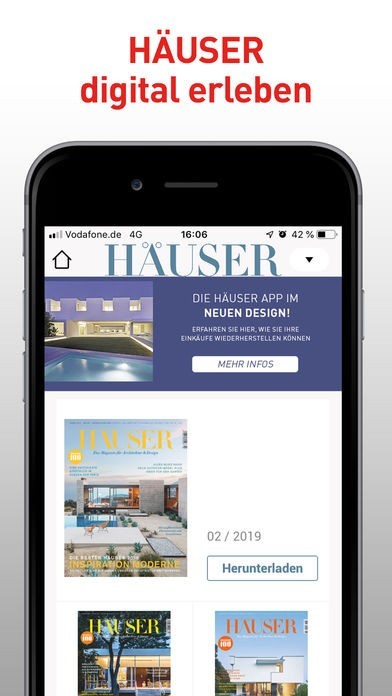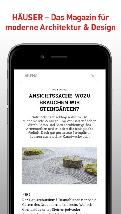 App Storeより引用Architektur. Wohnen. Design. HÄUSER ist das High-Class-Magazin für internationale Architektur, Design und anspruchsvolles Wohnen und genießt mit seinem ausgeprägten Gespür für Zeitläufe, Entwicklungen und Trends seit mehr als 30 Jahren größten Respekt in der Architektur- und Designszene.