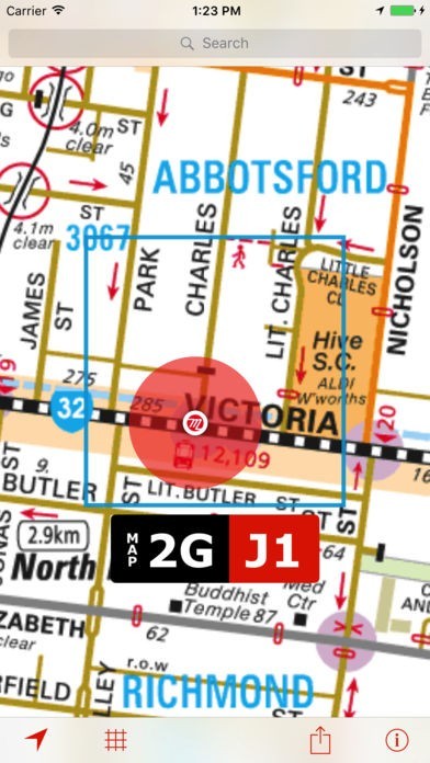 On iPad, Melway's familiar grid and coloured map borders move and zoom with you as you move the map around.