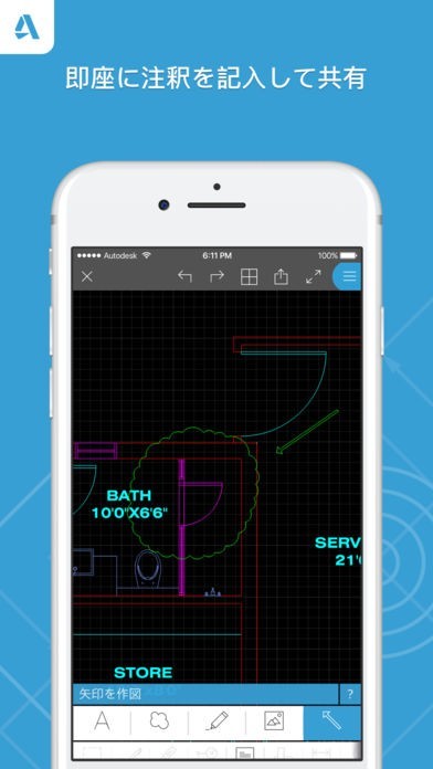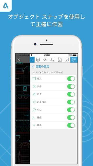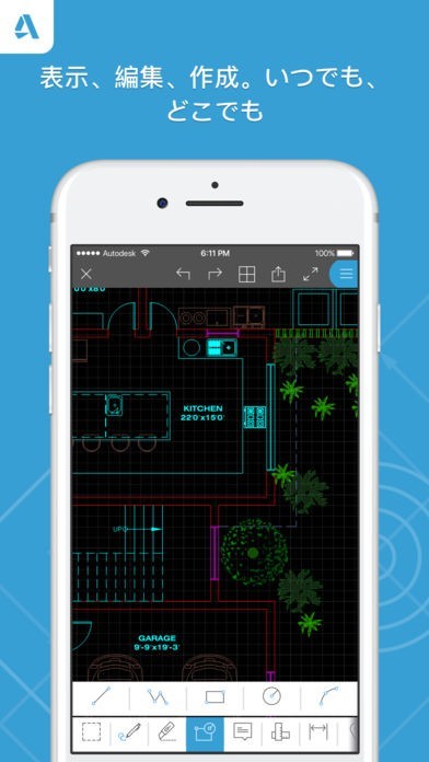 AutoCADのPC版で作成したファイルをスマホで閲覧したり図面の編集が可能となっています。