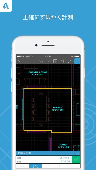「AutoCAD 360」はスマートフォンでいつでもどこでもCADによる図面作成をすることができるアプリです。このアプリはデスクトップ版のAutoCADと連携させることが可能となっているので、現場と事務所を双方向につなぎながら製図作業を進めることが可能となっています。オフライン状態で作成された製図はオンライン状態になったときに変更箇所が自動的に同期されるようになっているので、ネット環境がない現場であっても製図を進めることが出来ます。GPS機能を利用することで作成された図面内での現在の自分の位置情報を取得することもできるようになっています。