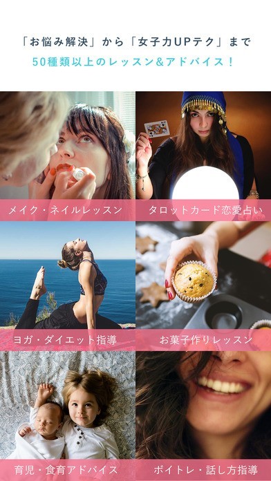 美容、ファッション、占い、恋愛・育児相談、ダイエット、英会話など、50種類以上の相談&レッスンメニューが、自宅で気軽に受けられます!