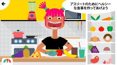 さてと、ご飯の時間だ、でも何を食べるかって?そうだね、それは君しだいさ。食材せいぞろいのキッチンで、パンをミキサーに入れたりチョコレートバーを揚げたり、リンゴを電子レンジでチンしたり…もっともっと自由に料理をしてみよう!アスリートな君を元気にする食べ物がいっぱいあるよ、果物やら野菜やらチーズやらケーキやら…ムムムム~ フィットネス&健康を保つのにアスリートは何を食べたらいいだろう?