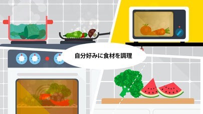 • 6種類の調理機器で食べ物を好きなように調理しよう(ゆでる、あげる、やく、きざむ、まぜる、など)