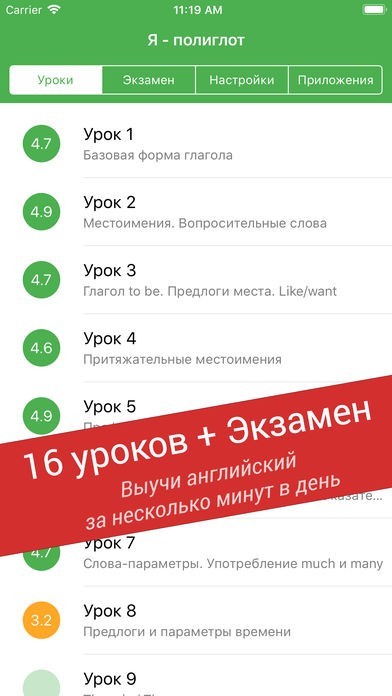 Программа запоминает результаты выполнения по каждому из уроков в экзамене. По завершении экзамена выставляется общая оценка и оценка по каждому уроку.
