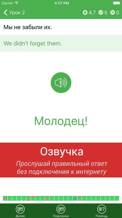 Если вы ответили правильно, программа похвалит вас. Если вдруг ошиблись - подскажет правильный ответ. Правильный ответ озвучивается.