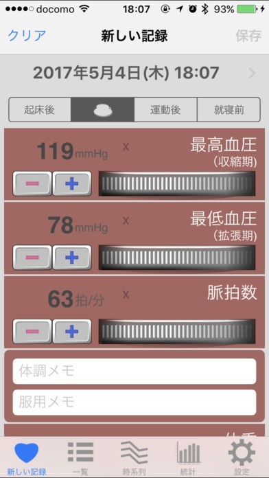 人間ドックなどで、高血圧などと診断され、体重や血圧を管理することを求められた方にとって、このアプリは簡単に記録が行なえて、それほど負担なく続けることが出来るでしょう。 プラスマイナスボタンによって、前日からの変化数分タップするだけで記録が行えるので、操作が楽です。 加えて、「体調メモ」と「服用メモ」を記載できるので、気になることがあれば書いておいてお医者さまにお伝えすることで、症状を把握してもらえる可能性が高まります。 集めたデータは「時系列」によって、グラフで変化が解りやすく示してくれたり、「統計」によって、分布図を示してくれたりするので、異常なばらつきなどを発見できれば、その原因を探り、症状の改善が期待できるかもしれません。