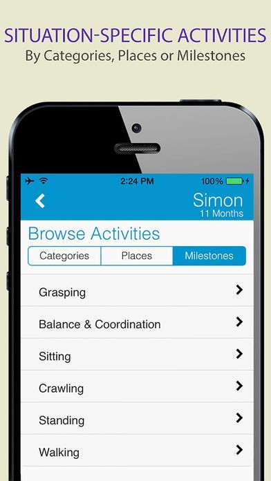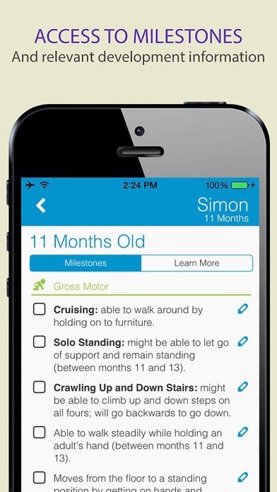 - All relevant content about key milestones in one place –specific to your baby’s age and organized by development category