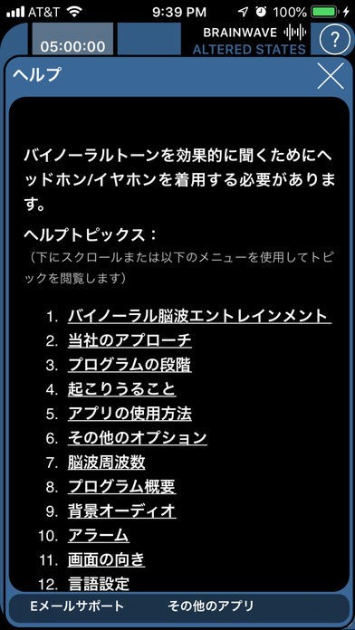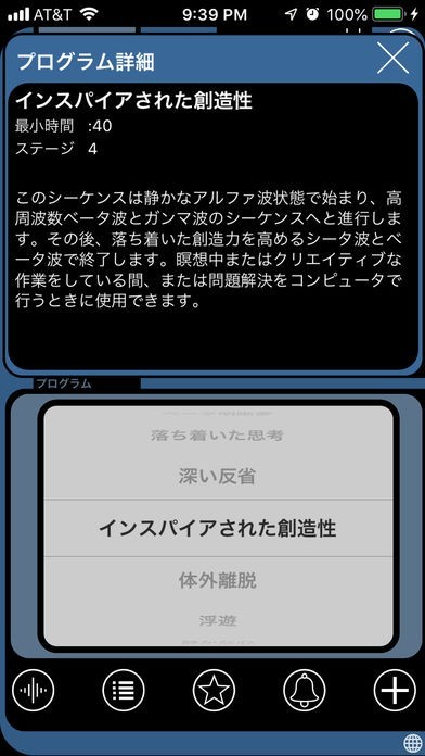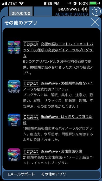 App Storeより引用さわやかなネイチャーサウンド、アンビエント音楽、お手持ちのiTunes Music(iTunesプレイリスト作成機能内蔵)、またはSpotifyやオーディオブックなどのアプリからのオーディオと組み合わせて、マインドコントロールに役立つバイノーラルシーケンスを作成します。* 明晰夢、マインドフル瞑想、夢見心地な眠り、幽体離脱、禅の瞑想などの強力なバイノーラルプログラム!* iPad、iPhone / iPod Touch用のUIを内蔵したユニバーサルアプリ。* 精神状態は直接再生しても聞こえない特定の脳波の周波数に関連付けられています。この周波数を左右の耳それぞれに対して2つの異なるトーンを間接的に再生することで、脳に不可聴周波数として認識させ、ターゲットの周波数の脳波を誘導することができます。聞くにつれて、自分の脳波がこの不可聴ビートと歩調を合わせるようになり、数分後にはターゲットの脳波周波数とシンクロします。