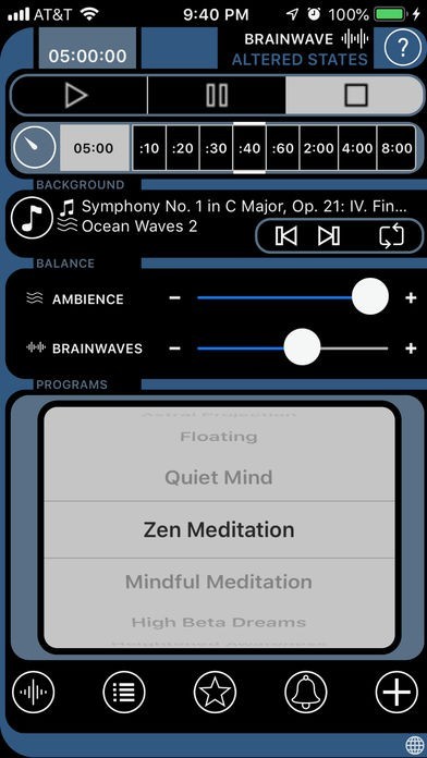 Brain Wave Altered Stateは、最先端のマルチステージバイノーラルシーケンスを使用しており、リラックスしたアンビエント背景サウンド、他のオーディオアプリ、またはお手持ちのiTunes Musicからサウンドを選択できる柔軟性を持ち合わせています。これは、連続脳波同調と呼ばれる独自のプロセスを使用して実現します。