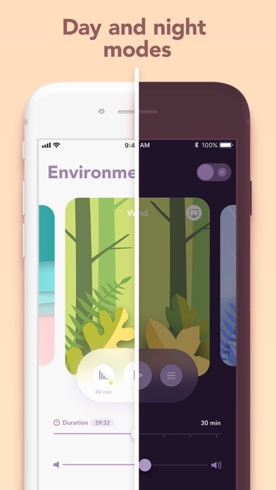 Environment noises: summer rain, tidal bore, forest, bonfire, plane cabin, fan.