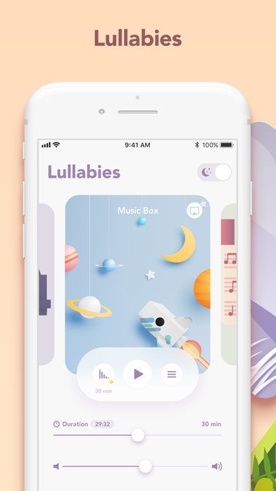 Lullabies: rhythmic xylophone, calming xylophone, harp.