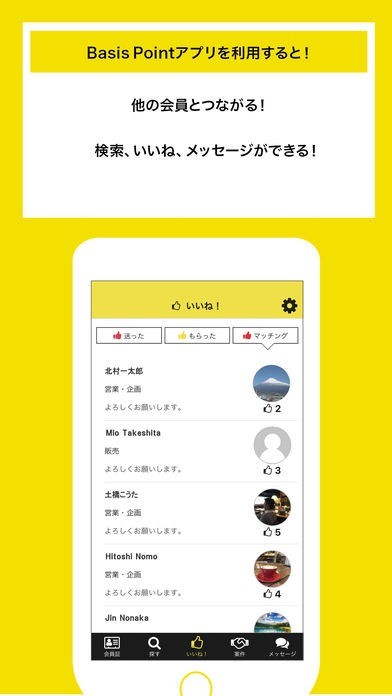 社会に出ると、積極的に出会いを求めなければ人間関係の広がりは期待できません。ビジネスにおいても同じです。本アプリでは、似通った日常を送っていては出会えなかった素晴らしい方々との出会いが期待できます。自分と違った職種の方と交流を持つことで、自分のビジネスに良い影響を与えてくれることも十分にあり得ます。