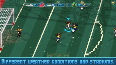 ドットのような絵柄がかわいいサッカーゲームです。仮想の十字キーとボタンを使って各選手を操作していきます。多数の国から一つの国を選び、ワールドカップなどの各大会を制覇していきましょう。
