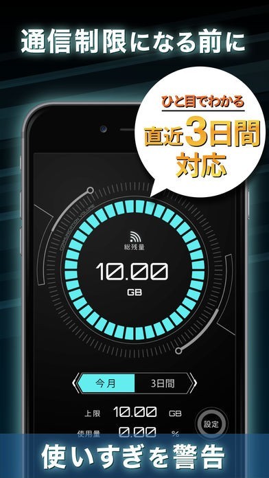 直近3日分の通信量を一目で確認することができます。設定した通信量を越えると警告が出るように設定することができるので、使いすぎて速度制限がかかるのを防いでくれます。