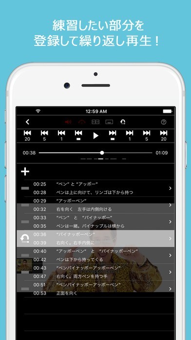 「re-play-er」は動画の見たい部分だけを何度でも繰り返し再生することができる動画再生プレイヤーアプリです。再生することができるのはスマートフォン内のiTunesコンテンツやカメラロール内にある動画、YouTubeのコンテンツとなっていて、動画の中の繰り返し再生したい範囲を指定することで何度でも繰り返し再生することが出来るので、歌の練習やダンスの練習をするのに役立つアプリとなっています。さらにメモ表示機能で注意点をメモしておいたり、再生スピード調節機能でスローで動画を確認して難しい部分をチェックしたりと、役立つ機能が搭載されています。