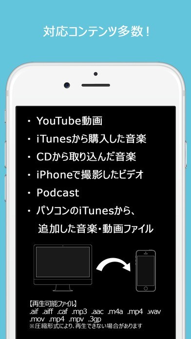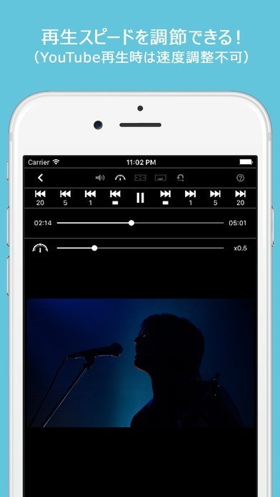 ダンスや歌の繰り返し練習にも最適! 「re-play-er」は、音楽や動画のリピート再生に便利なツールです。 mp3形式やaif形式など多様なファイル形式に対応、カメラロールからの選択はもちろんのこと、YouTubeやiTunesからの動画再生も可能。 使いやすい再生スピード調整機能を活用すれば、ダンス動画などの再生速度を指先で細かく調整しつつ、スローモーションで動きを研究することができるでしょう。 メモ表示機能も搭載。歌詞やコードをあらかじめ入力し、ファイル再生に合わせて画面表示も行えます。