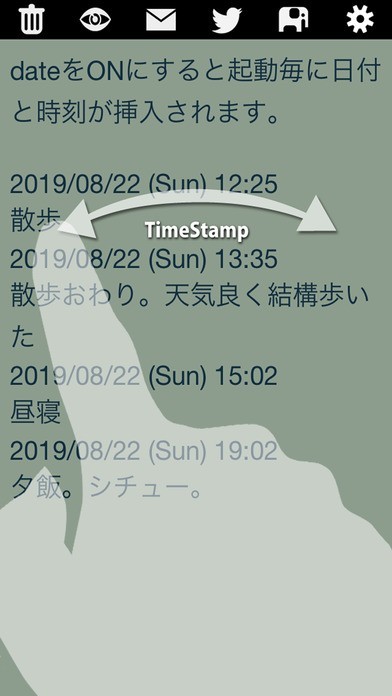 タイムスタンプをONにすると起動毎に日付を挿入できます。勉強や散歩の開始時刻など、ストップウォッチで計る程でもないけれど、簡単に時間を記録したい場合にも利用できます。