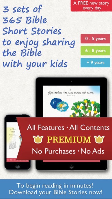 • This free app provides you a daily illustrated Bible story in simple words and with beautiful pictures for your children (0-5 years, 6-8 years, +9 years).