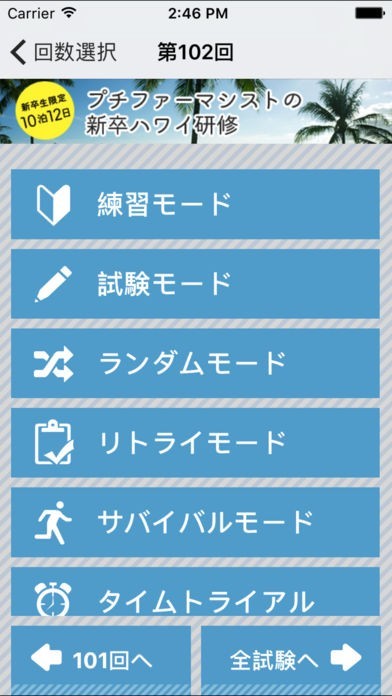 好きな問題、過去に間違った問題を選んで解答できる練習モード