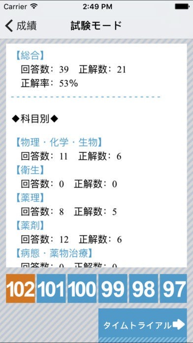 解答した試験モードの正解率や、トライアルモードの最高記録を保存・管理!
