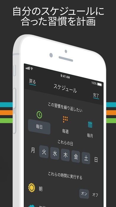 土曜日の晩や、月曜日の朝など行う日時があらかじめ決まっている習慣を登録することができます。頻度も含めてスケジューリングできるため、入力がサクサク行える機能です。