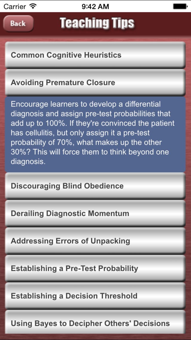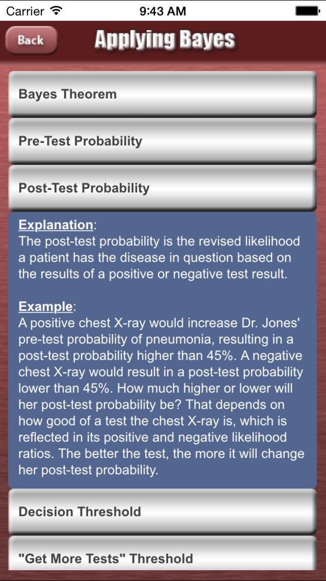 Use over 175 likelihood ratios to apply Bayesian reasoning to clinical care in real-time! A little rusty on biostats? Use our case-based statistics review to refresh your memory on applying Bayes to patient care, and then turn to our teaching tutorial to learn about common errors in diagnostic reasoning and how to use Bayes' theorem to turn clinical pitfalls into teaching opportunities!