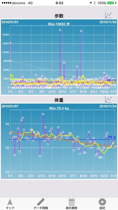 iPhone5S以降でiOS8を搭載しているiPhoneの歩数計データとヘルスケアアプリから情報を読み込み、歩数、歩行距離、消費カロリー、体重、BMIのデータをグラフ化します。