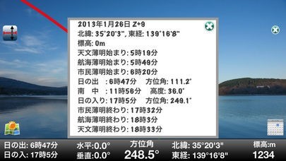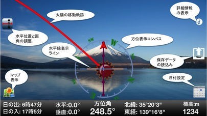 日の出や日の入の時刻の正確な情報の他、太陽の移動軌跡、水平線表示ライン、マップ表示、方位表示コンパスなどのジャンルも扱っています。 日付の場所の設定を行うと将来の日の出、日の入りの情報まで閲覧できるようになります。 日本国内は勿論のこと、世界中の情報閲覧ができるため、海外旅行時にも利用できます。 日の出、日の入りの時間帯になると美しい景色が眺められると言う場所へ旅行に行く時にも便利です。