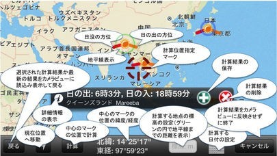 マップ表示で、世界中の地点の日の出や日の入、南中、各種薄明の時間などが表示され解りやすく便利です