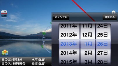 カレンダーボタンをタップすると知りたい日時の日の出、日の入の情報を計算してくれます