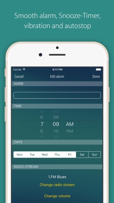 - shake to stop the alarm but to continue the radio streaming (e.g. to listen in the bathroom)