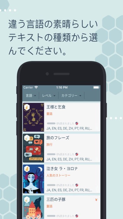 面白く、ユニークなストーリーになっている物語をいくつか読むことができます。読み進めることによって内容を理解する楽しさを味わうことができるので、とても使い勝手が良いです。