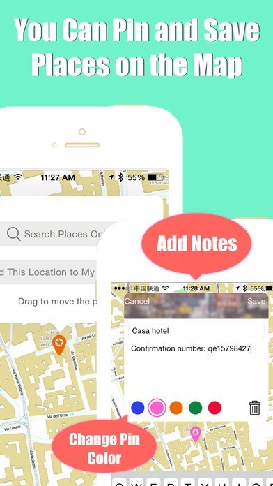 9. マップ上に自分でピン表示を付ける ― 地図上に表示されてない場所に行きたい? 心配なし、ブックマーク機能を使って、地図上にあなた自身でポイントを追加できます。手作業でピンを留めるもよし、オンラインデータベースから検索するもよし。さらに、ホテルの予約ナンバーやレストランの予約情報など、その場所についてのメモもかんたんに書き込めます。