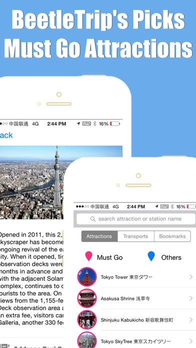 App Storeより引用BeetleTrip 東京トラベルガイド プレミアム は、海を越えた究極の旅の友です。リアルタイムで東京でのあなたのGPS位置をオフラインで知らせ、追跡します。特筆すべき機能なのが、3G/4GやWi-Fiなどといった、ネットワークがまったく必要ないこと。100%オフラインで使用できます。拡張式のリアルな道順ガイド、オフライン・シティマップ、交通情報検索、絶対見るべき観光アトラクションなど、旅行の計画に必要な全ての情報をこのアプリがご提供。しかもApple Watchをサポート。海外旅行中のローミング料金を節約します。