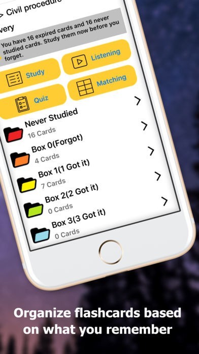 Using Multistate Bar Exam MBE will help you learn faster and remember more in a shorter time by showing flashcards just before you will forget them. MBE Flashcards app has several learning modes: Study, Slide show, Matching, Memorize, Quiz to make the learning process for MBE exam more exciting and fun.