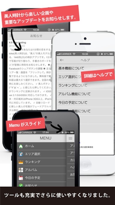 ・シェア:facebook/twitterで美人時計モデルが時間をお知らせしてくれます。