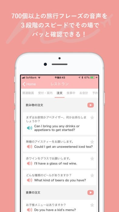 はじめての海外旅行で、突然英会話が必要になってしまった、レストランで注文しなければいけない時などにこのアプリが役立ちます。すぐにフレーズを確認して使うことができます。