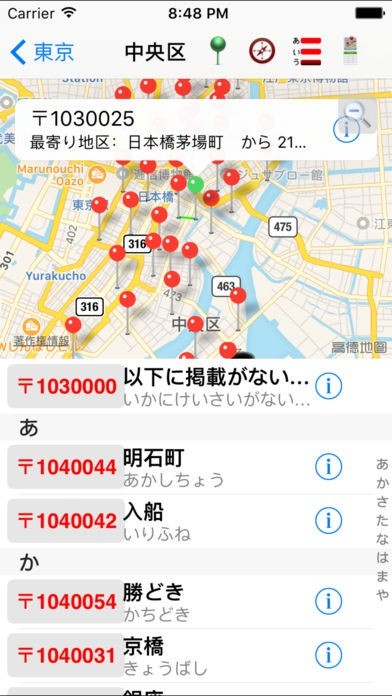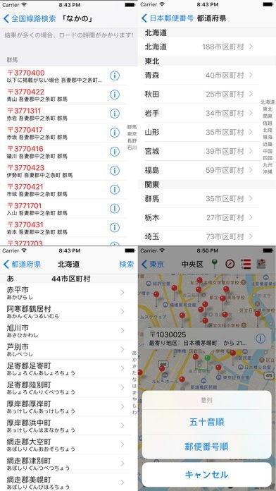 五十音順や、郵便番号順で表示できるので使いやすい!