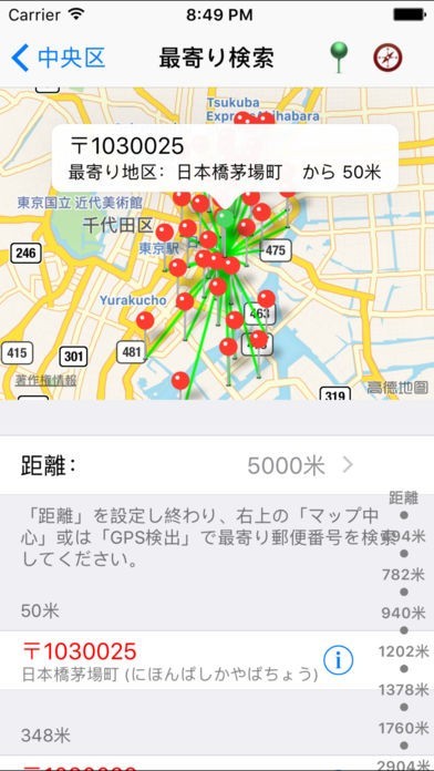 GPSを利用して、指定距離を全て表示させることも可能です。具体的に住所が分からない時などに便利です。よく利用する郵便番号はお気に入り登録をしておくことですぐに見つけられます。