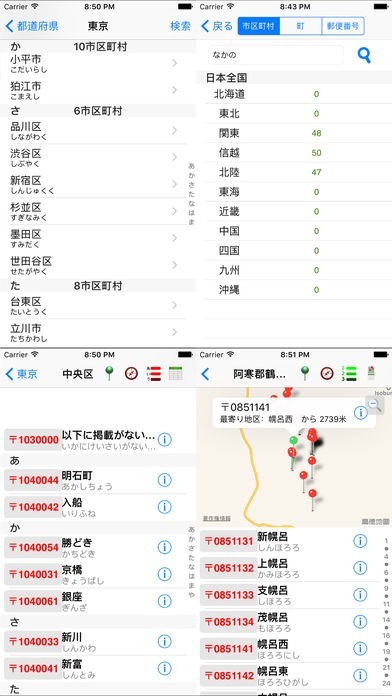 五十音順・郵便番号順で整列させることができ、地域が分かっている場合は五十音順で検索すると見つけやすいです。ひらがな入力だけで検索ができるので、簡単で使いやすいです。