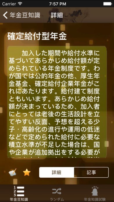 年金の仕組みや豆知識に関する問題が豊富に収録されているので、理解度をより深めたい方に必見でしょう。択一形式なので簡単に回答を行っていく事が可能ですよ。ランダム表示に対応しているのも特長です。
