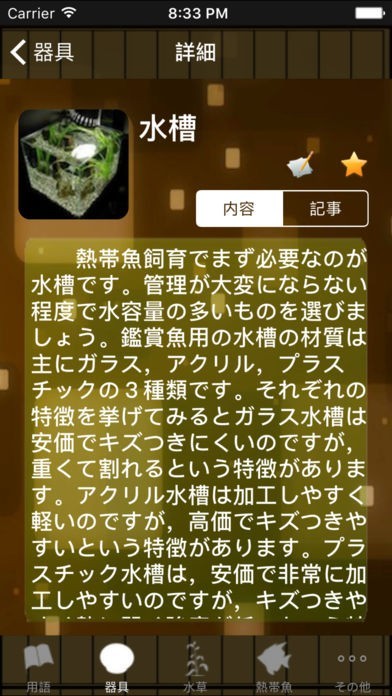 このアプリは熱帯魚図鑑や、熱帯魚の飼育法、飼育器具などの熱帯魚に関するあらゆる情報が詰まったアプリです。水草の育成方法などもあるので熱帯魚を飼う時に役立つアプリです。